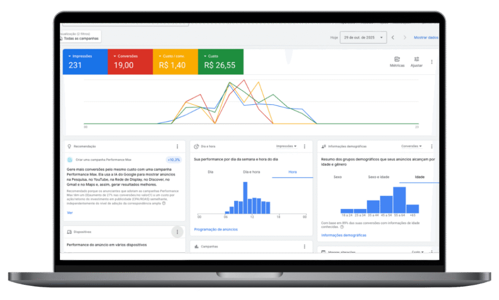 Cada ação é pensada para gerar retorno: seja campanha de crescimento, vendas, remarketing — com dados em tempo real.
